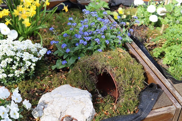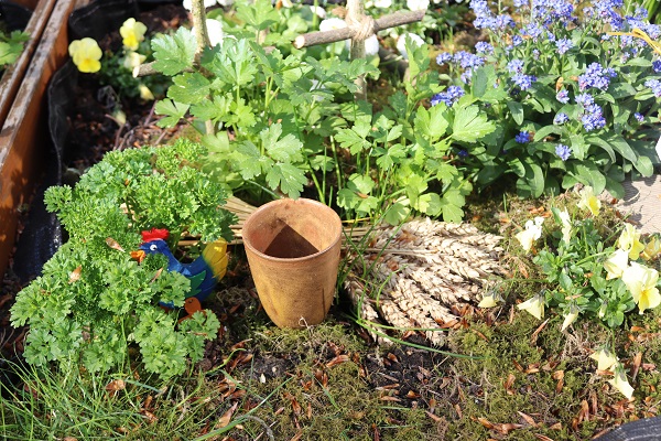 In den Hochbeeten in unserem Garten gibt es nicht nur Frühlingsblumen zu bestaunen: Mitarbeiterinnen und Bewohnerinnen gestalteten passend zu den Kar- und Ostertagen einen kleinen Ostergarten. An verschiedenen Stationen kann der Verlauf der Kar- und Ostertage symbolisch nachvollzogen werden.