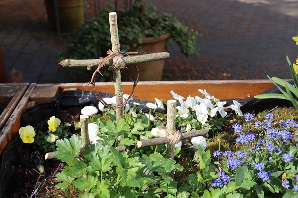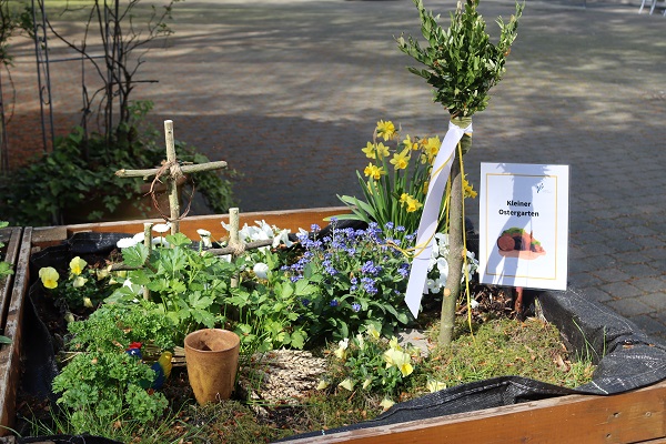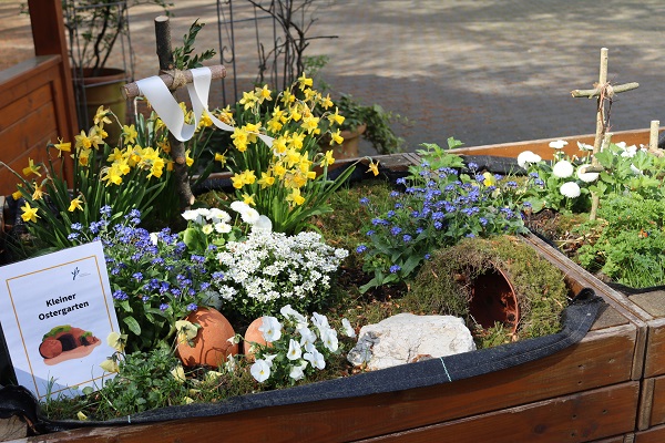 In den Hochbeeten in unserem Garten gibt es nicht nur Frühlingsblumen zu bestaunen: Mitarbeiterinnen und Bewohnerinnen gestalteten passend zu den Kar- und Ostertagen einen kleinen Ostergarten. An verschiedenen Stationen kann der Verlauf der Kar- und Ostertage symbolisch nachvollzogen werden.